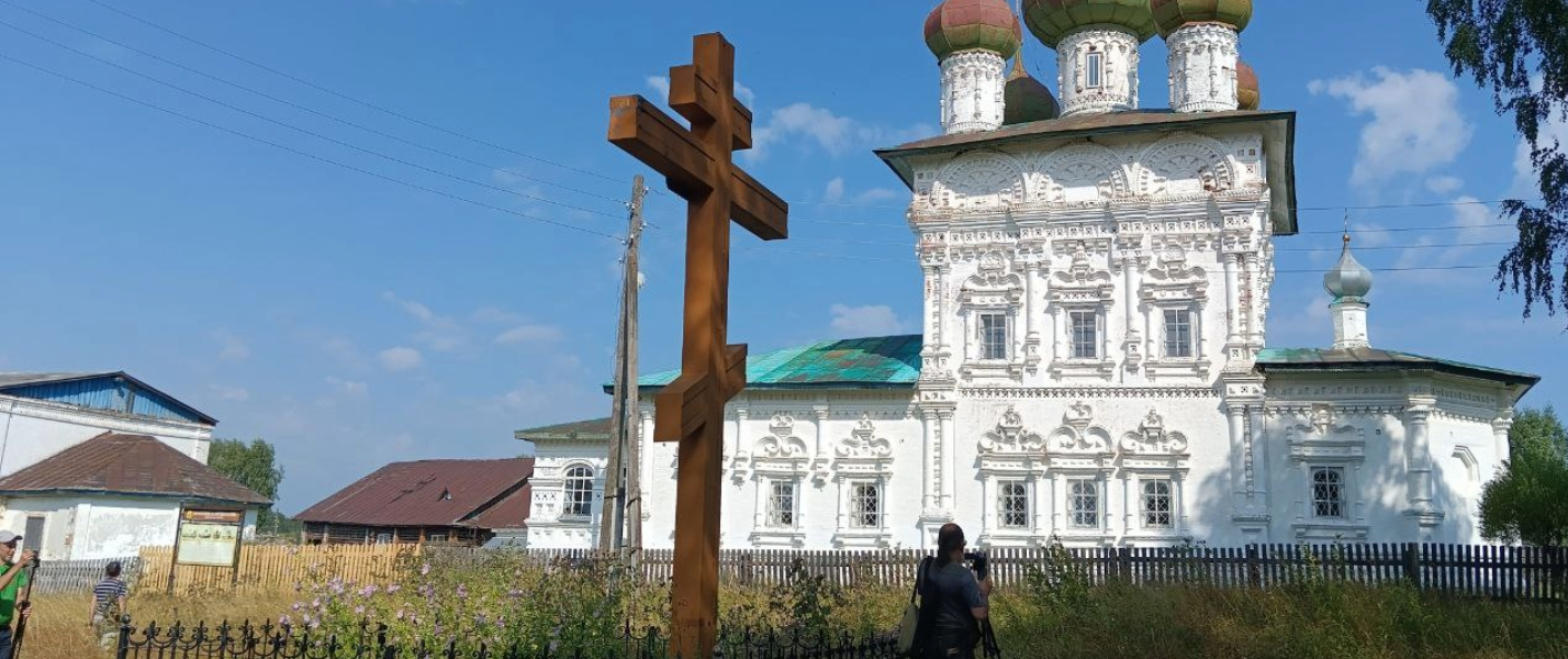 Памятный крест возле храма в селе Бондюг. Волонтеры забрали табличку для восстановления.