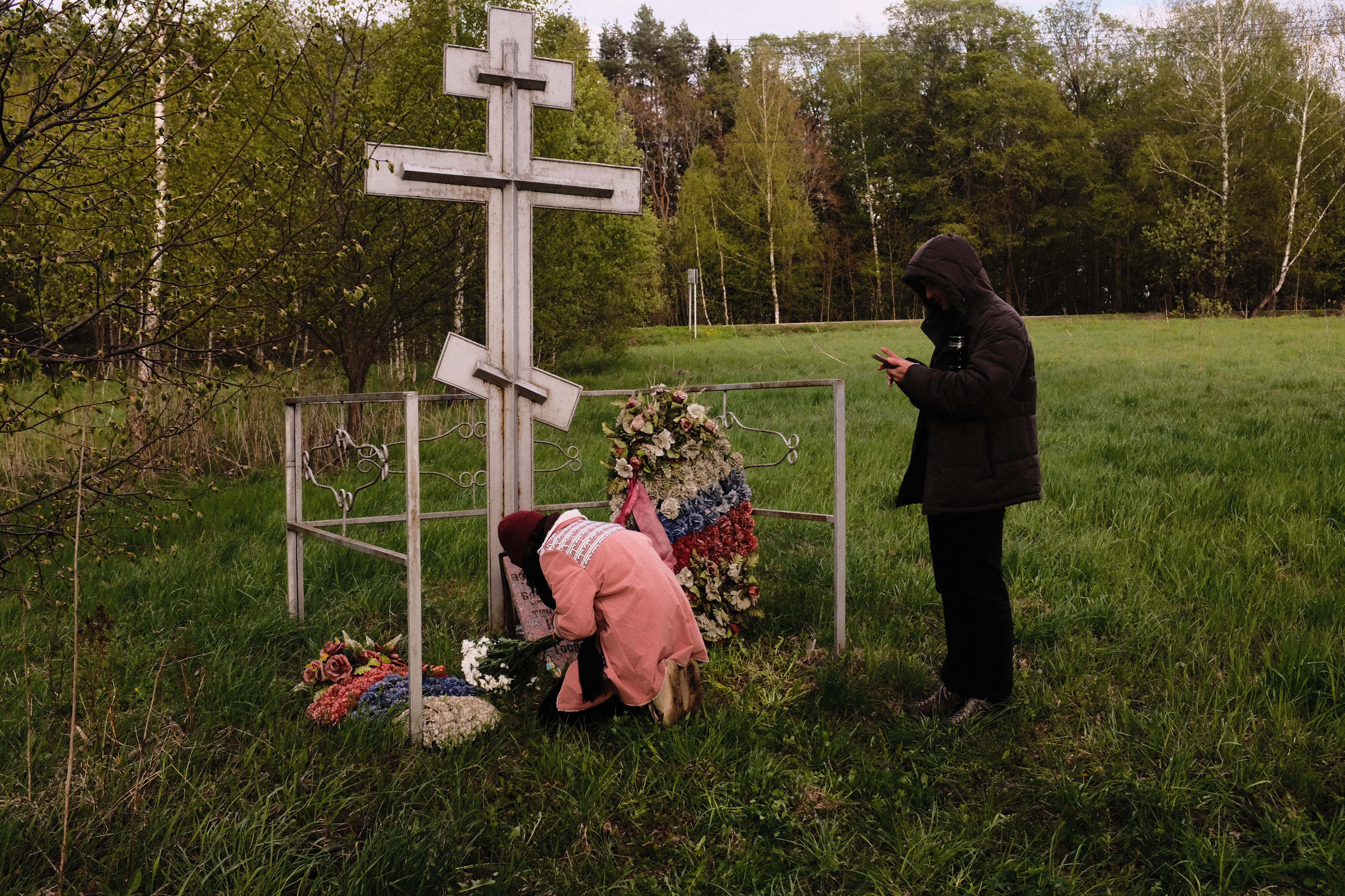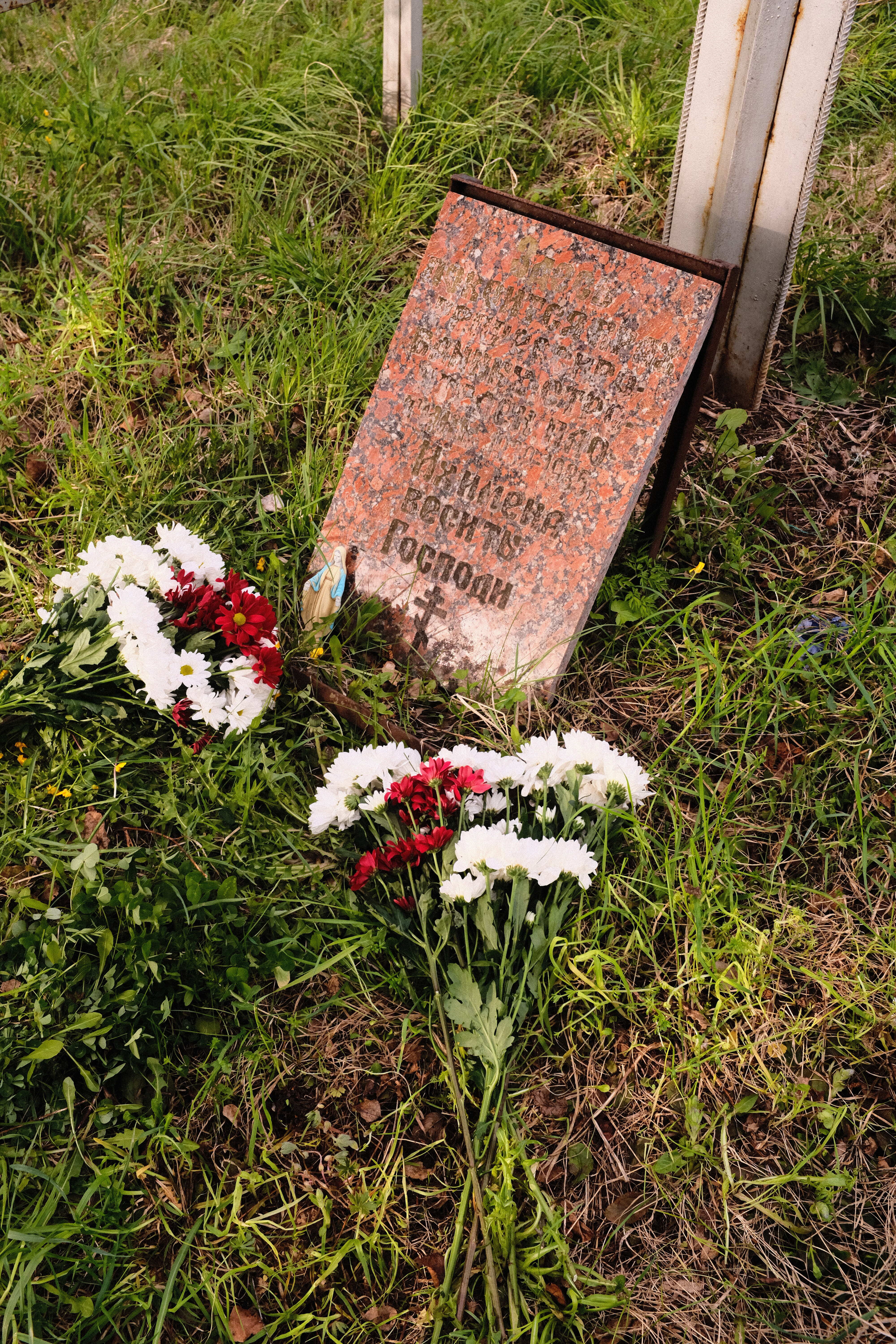 Потом мы наткнулись на собаку у будки охраны, поплутали еще и, наконец, вышли к дороге на Ламишино. Там мы зашли в Церковь Казанской иконы Божией Матери, чтобы спросить, где находится этот крест. Мы разговорились с местным протоиереем Николаем Ельчевым, и оказалось, что он был одним из инициаторов установки этого креста. По его словам, в 1997-1998 годах в этом месте благодаря описаниям местных жителей было найдено захоронение. Останки перезахоронили, а поверх поставили памятный крест. Николай Ельчев подсказал нам направление, и вскоре мы отыскали его — захоронение находится примерно в 400 метрах к северу от церкви.